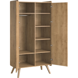 Armoire vintage à 2 portes avec 6 étagères spacieuses et une tringle à vêtements. Les portes ouvertes par pression permettent un accès facile à l'intérieur du meuble. Sur le côté gauche se trouvent 2 étagères : supérieure et inférieure, entre lesquelles se trouve une barre pour cintres. Le côté droit de l'armoire dispose de 4 étagères sur lesquelles vous pouvez facilement organiser des vêtements ou des jouets. L'armoire n'a pas de poignées saillantes - elle est équipée d'un système push to open. Le confort d'utilisation est augmenté par des ferrures de haute qualité. Par souci de sécurité, les bords du meuble ont été arrondis. Les longs pieds diagonaux confèrent à l'armoire une légèreté visuelle et permettent un accès pratique au sol, ce qui facilite la propreté de la chambre du tout-petit. Une simple garde-robe de style rétro peut être utilisée pendant de nombreuses années.
