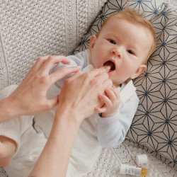 Huile calmante gingivale. Pour les bébés grognons avec les joues rouges. Apaise, calme et amollit la gencive lors des poussées dentaires. A partir de 3 mois.