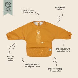 Plaisir garanti à table avec nos animaux rigolos ! Ce chouette bavoir est équipé de longues manches, ultra pratiques pour éviter que votre enfant se salisse en mangeant ou en buvant. La poche pratique permet de récolter proprement tous les aliments qui tombent en chemin entre l’assiette et la bouche de votre enfant. Et pour ne rien gâcher, le bavoir est fabriqué en polyester 100 % recyclé et résiste à l’eau ! De quoi gagner un temps précieux au nettoyage.