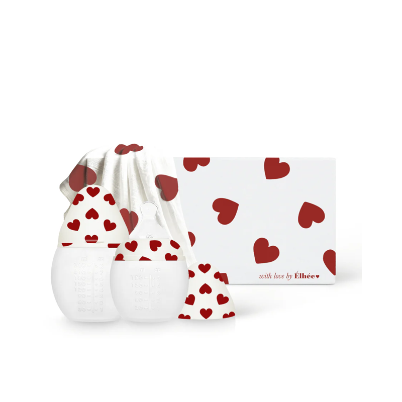 Le Coffret Full of Love | Iconique Edition de la marque française Élhée est bien plus qu'un simple cadeau de naissance : c'est une déclaration de tendresse. Conçu pour accompagner les premiers jours de bébé, cet écrin élégant réunit les essentiels de la marque, ornés du motif "Cœur" intemporel et poétique.