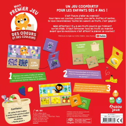 C’est l’heure d’aller au marché ! Pour faire vos courses, piochez une carte, frottez et sentez. Si vous reconnaissez toutes les odeurs de fruits, c’est gagné ! Mais attention ! Il y a des fruits pourris qui trainent dans les étals. Il faut retrouver tous les fruits du marché avant que la moisissure n’ait atteint le panier de courses !Mon premier