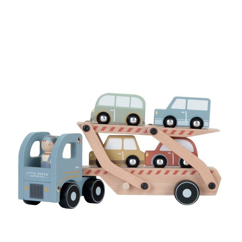 Mon dieu ! Une voiture en panne au bord de la route. Le camion en bois roule facilement avec les 4 véhicules inclus vers le garage.