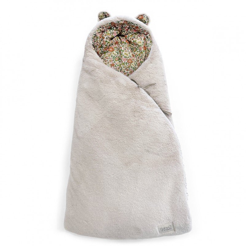 Il se ferme via des nœuds en lin latéraux. La partie inférieure du sac peut être ouverte via une fermeture éclair afin que vous puissiez introduire le bébé plus facilement. Extérieur en tissu polair beige, Intérieur en tissu Liberty
