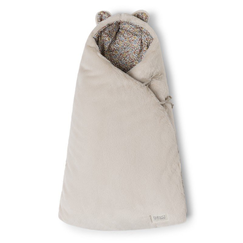 Il se ferme via des nœuds en lin latéraux. La partie inférieure du sac peut être ouverte via une fermeture éclair afin que vous puissiez introduire le bébé plus facilement. Extérieur en tissu polair beige, Intérieur en tissu Liberty