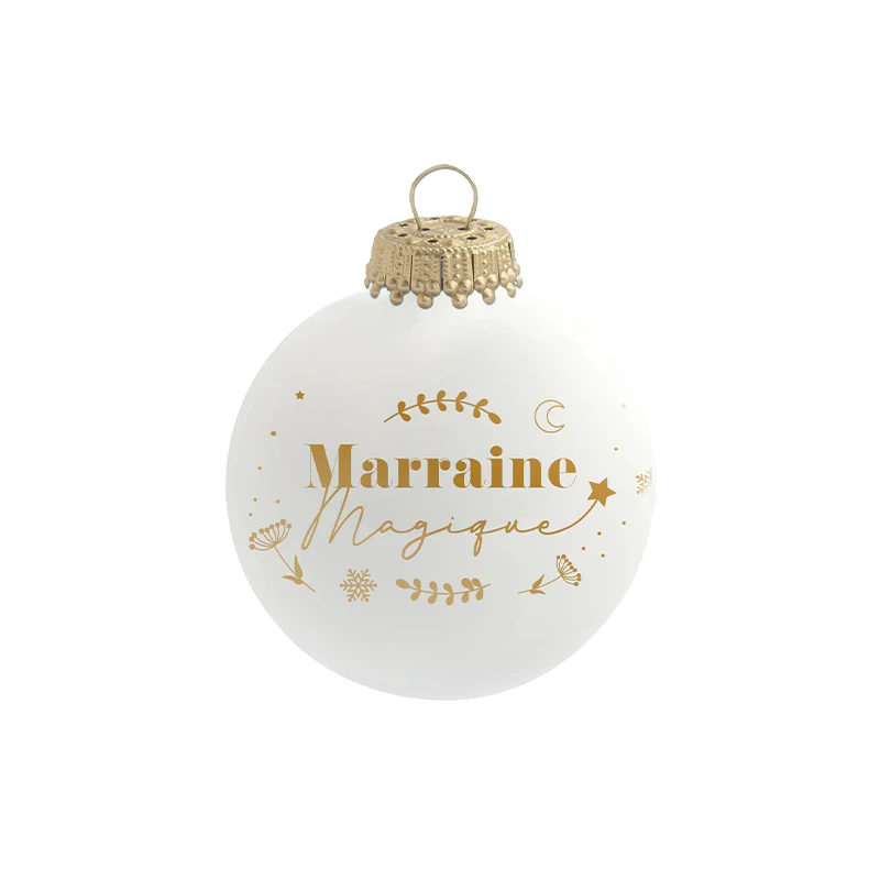 Fabriquée avec soin et qualité en verre soufflé à la bouche, elle est sublimée par une inscription dorée étincelante sur son verre blanc laqué. C'est une décoration qui non seulement illuminera son sapin, mais deviendra surtout un précieux souvenir durable, témoin de ce lien unique, année après année. Un incontournable à offrir pour un baptême ou à Noël !